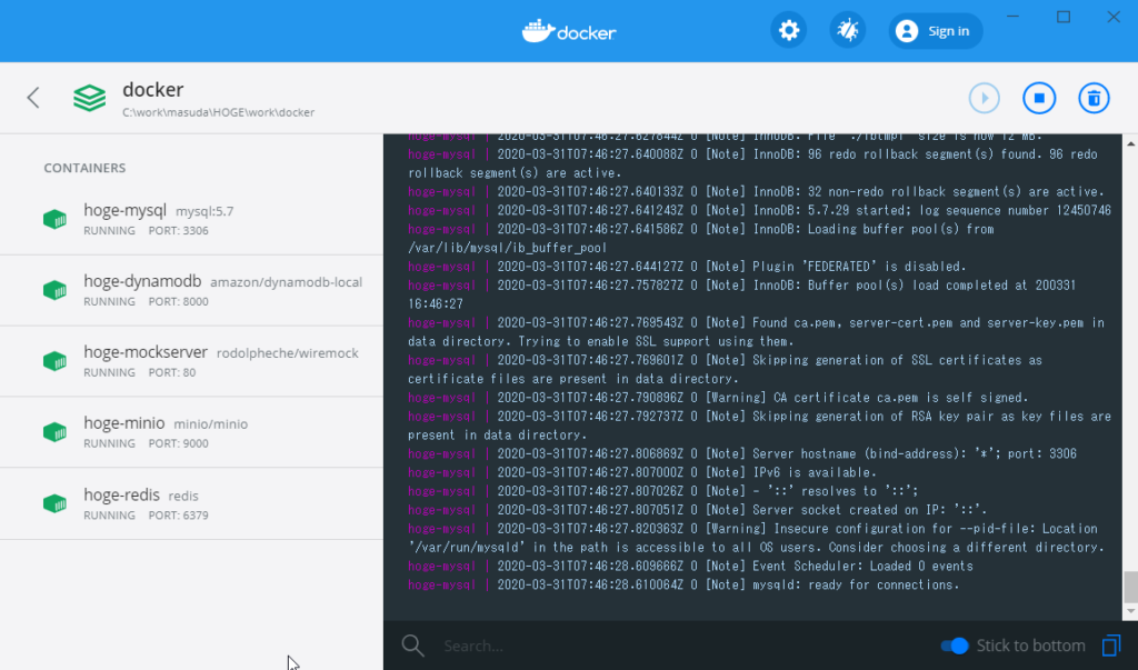 Docker(Windows10版、mysql、redis、dynamodb、minio(S3)、rodolpheche)を試す