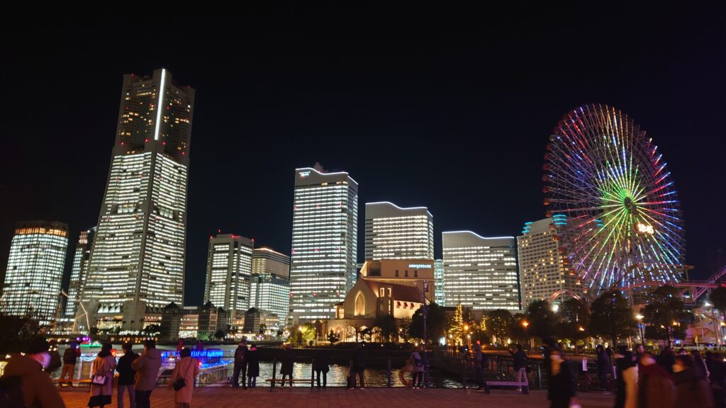 みなとみらいのイベント「TOWERS Milight」が開催され、みなとみらいエリアのビルの照明を点灯し、イルミネーションとなっています。