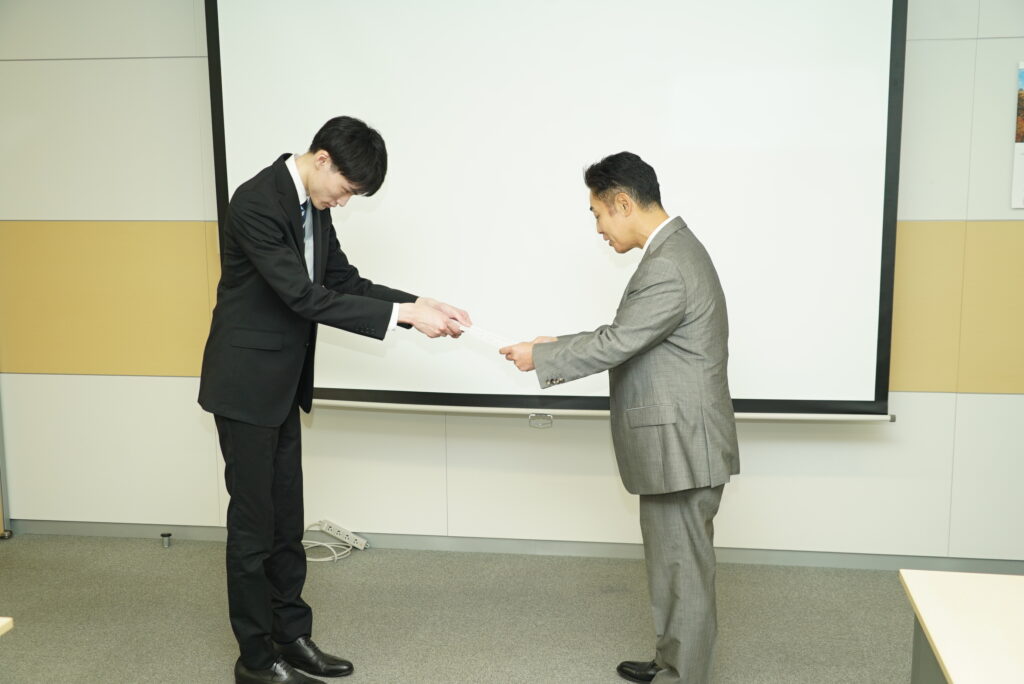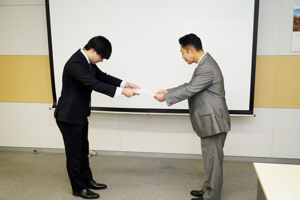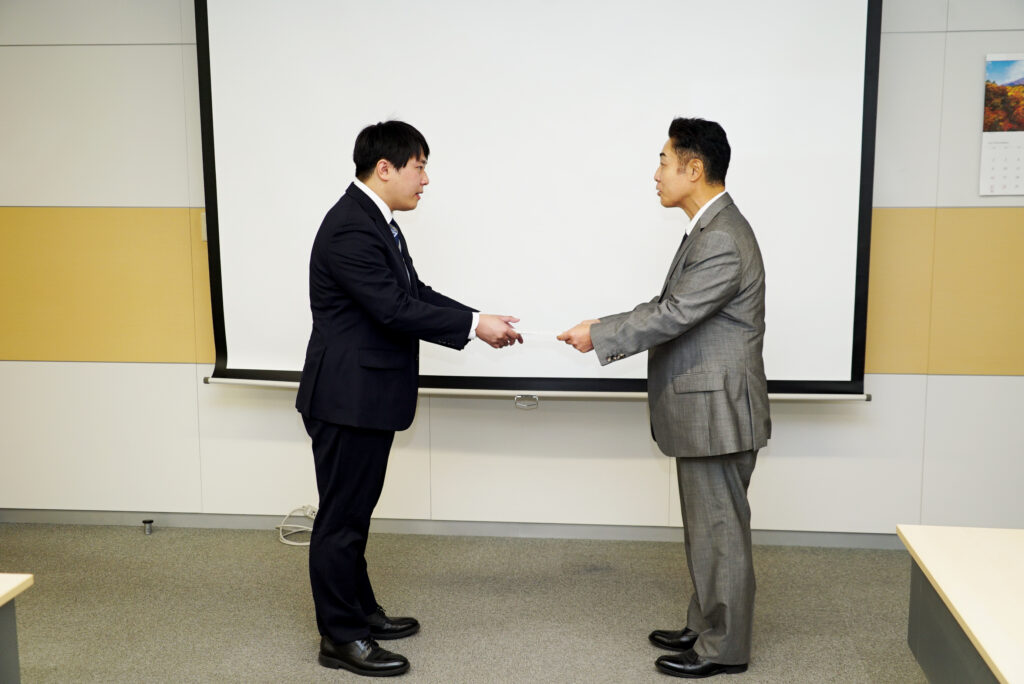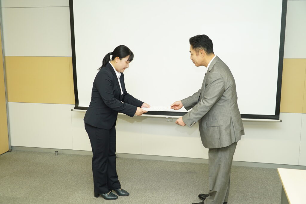 内定証書授与では、代表からお一人お一人にお声がけをしていただいており、入社への意気込みも強くなったのではないでしょうか。少々緊張しておりましたが、素敵な笑顔で受理されました。