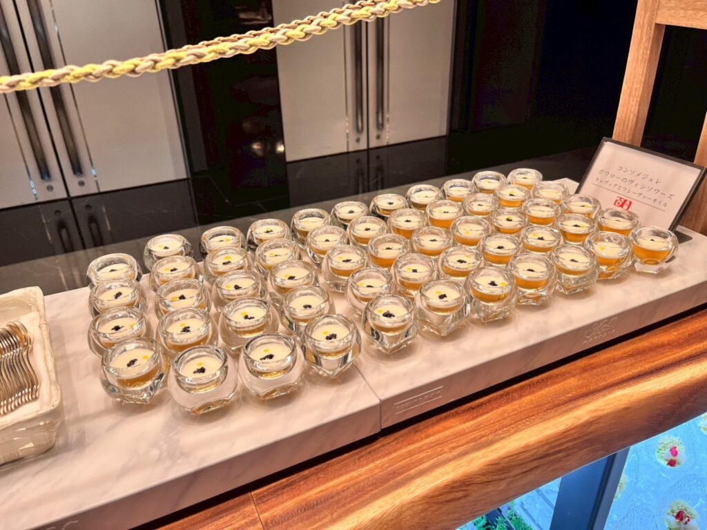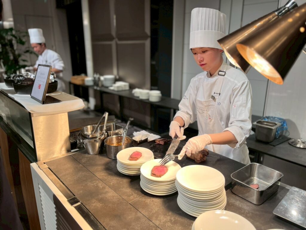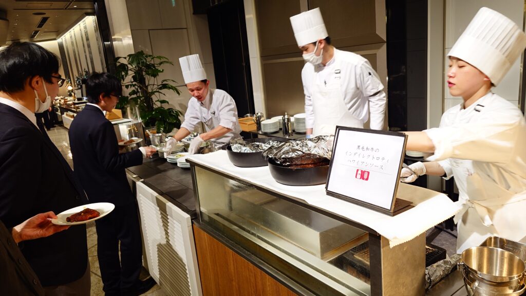 会場に一歩足を踏み入れると、そこにはキラキラと輝くシャンデリアと、ずらりと並んだ豪華な料理の数々。 ローストビーフの切り分けサービスや、色鮮やかな前菜、魚介、様々なデザートなどなど……。「どれから食べよう?」と迷うのも、ビュッフェならではの醍醐味ですね。